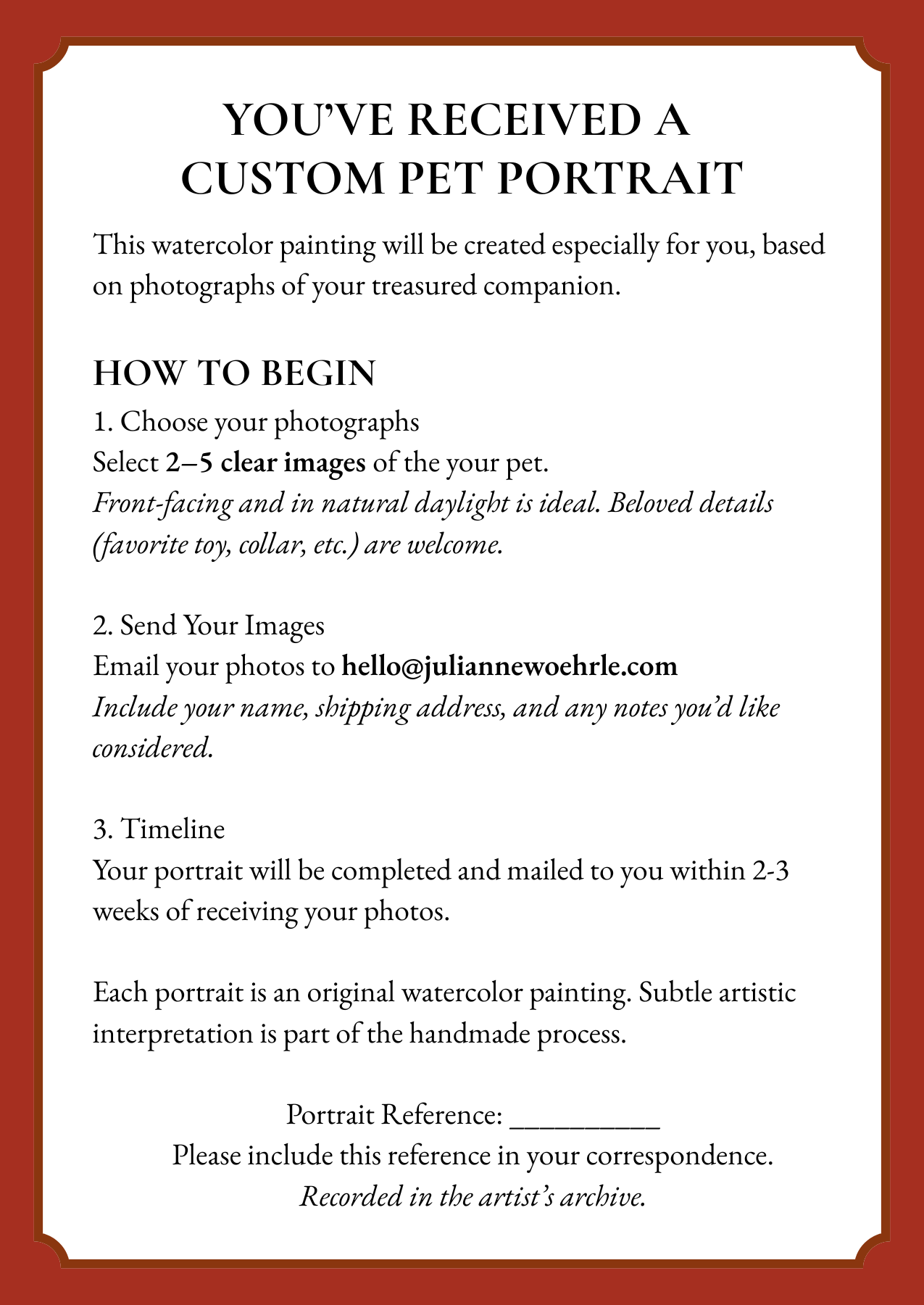The recipient will submit photos and notes using the enclosed instructions, and their pet will be painted as a one-of-a-kind watercolor portrait.