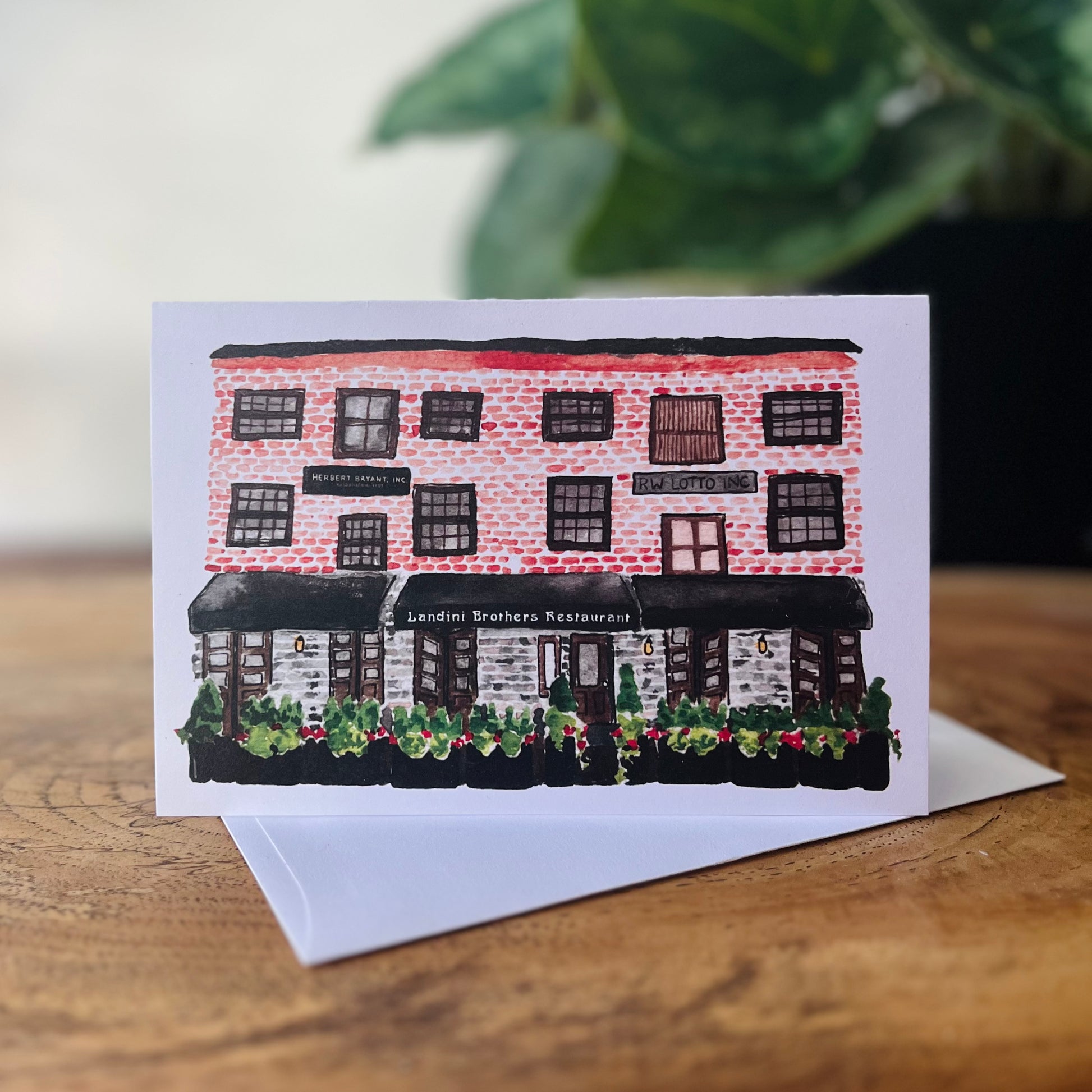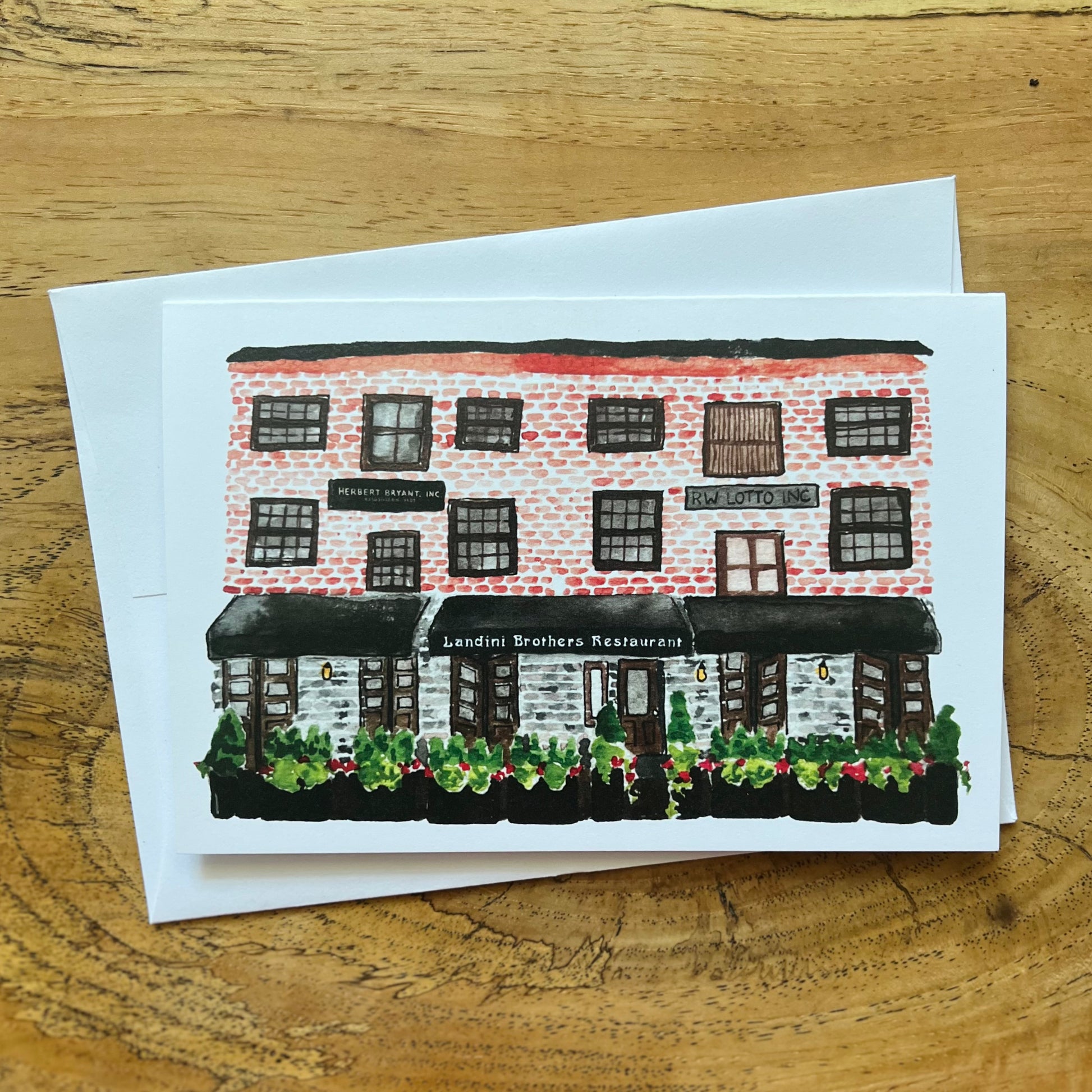 Cozy, inviting scene of Landini’s Italian restaurant in watercolor. 4x6 folded card, blank inside, with envelope. Artwork by Julianne Woehrle — part of my “Old Town” series.