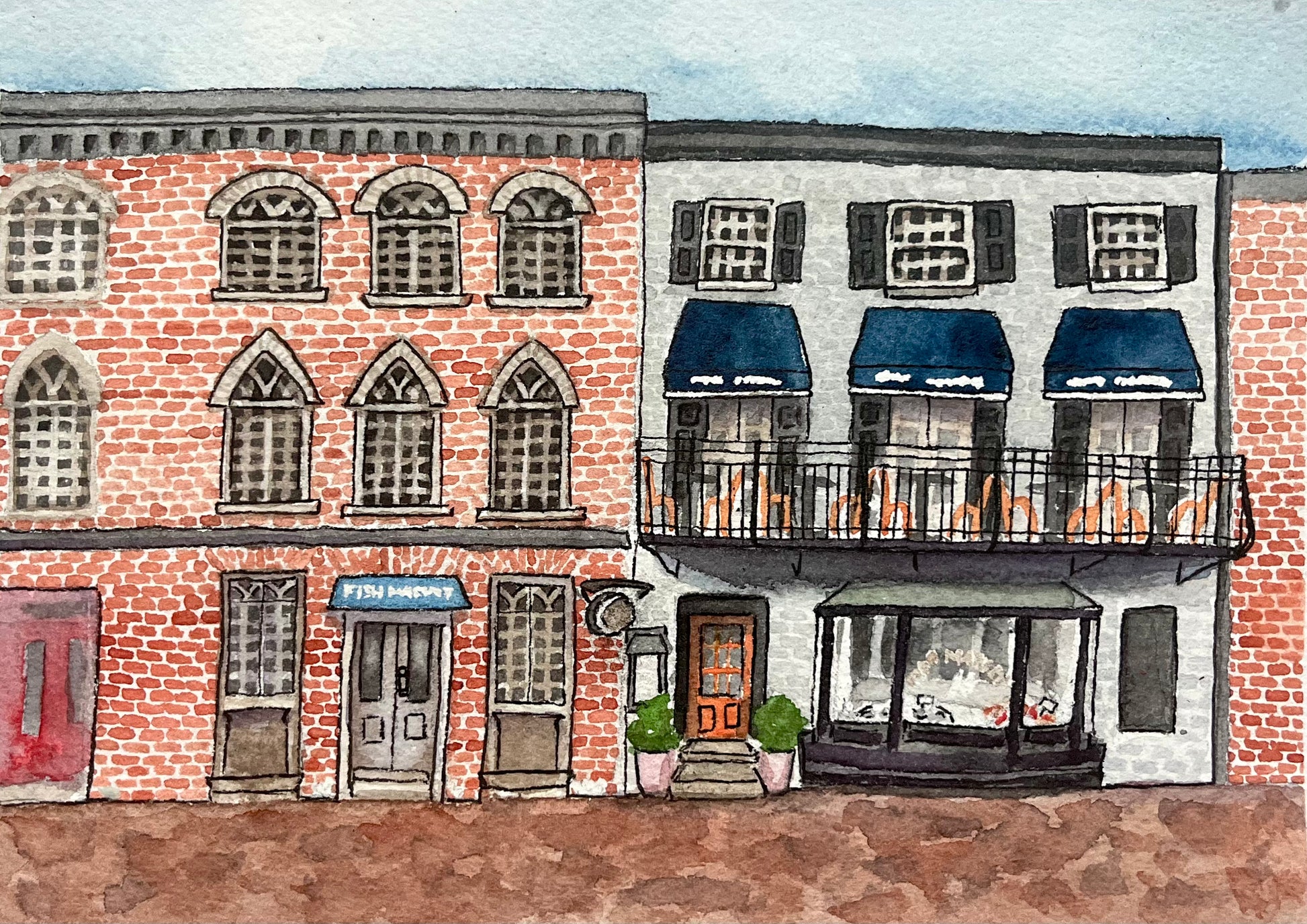 A portrait of The Fish Market in watercolor. 4x6 folded card, blank inside, with envelope. Artwork by Julianne Woehrle — part of my “Old Town” series